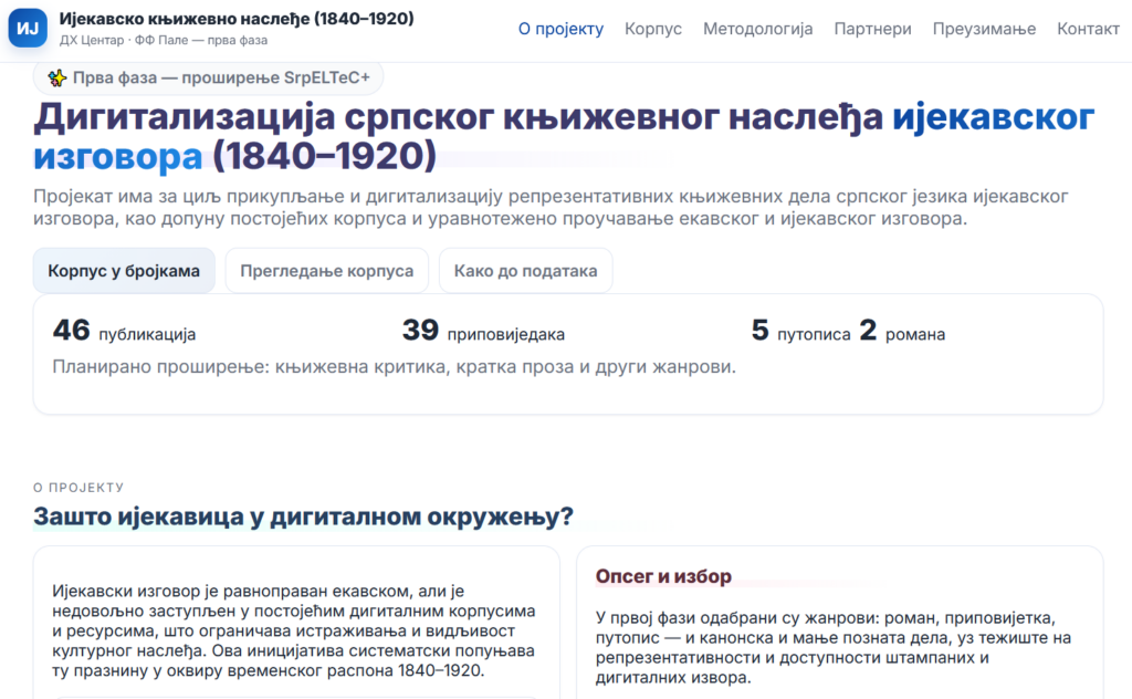 Корпус SrpELTeC-ijk формиран у оквиру пројекта Дигитализација српског књижевног наслеђа ијекавског изговора представља проширење корпуса SrpELTeC који је настао у оквиру завршене COST акције под називом Distant Reading for European Literary History (COST Action CA16204).